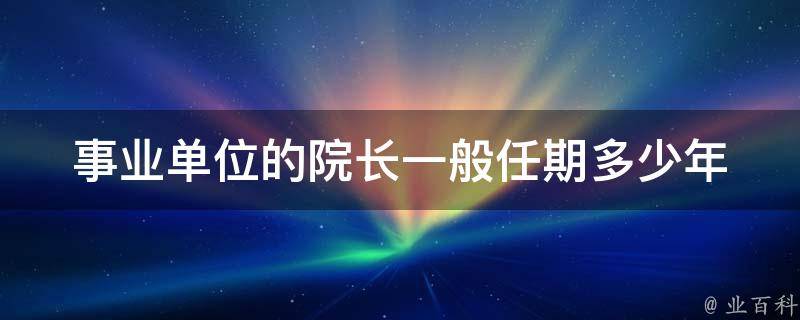 事业单位的院长一般任期3至5年。按照《事业单位领导人员管理暂行规定》第四章第十九条规定事业单位领导人员一般应当实行任期制。每个任期一般为三至五年,领导人员在同一岗位连续任职一般不超过10年,工作特殊需要的,按照干部管理权限经批准后可以适当延长任职年限。