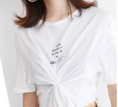 6、胸前打结:在胸前喜欢的位置将T恤向里卷,然后用皮筋将其固定。整理好外侧的褶皱。