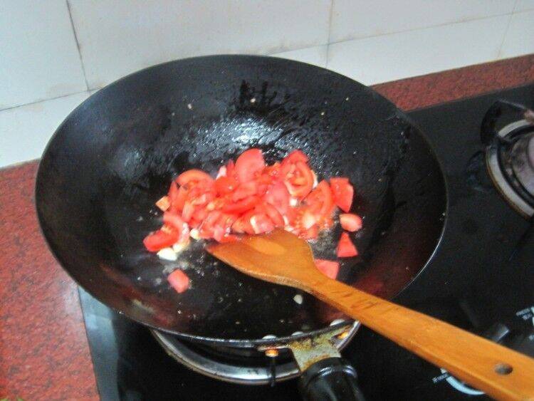 3、锅中热油爆香蒜米后把瘦肉放入翻炒。