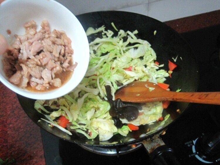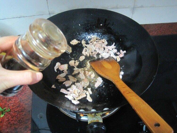 4、瘦肉变白后淋适量生抽然后盛出来备用。