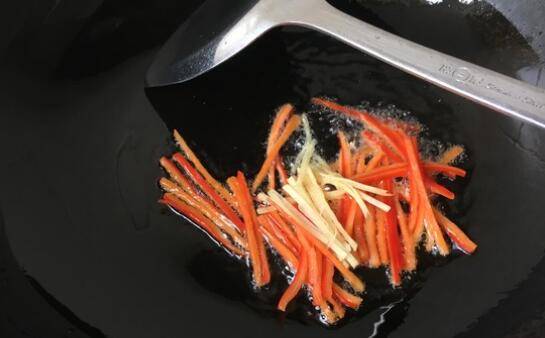 4、跟着放入姜丝和红椒丝煸炒片刻。