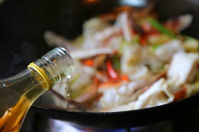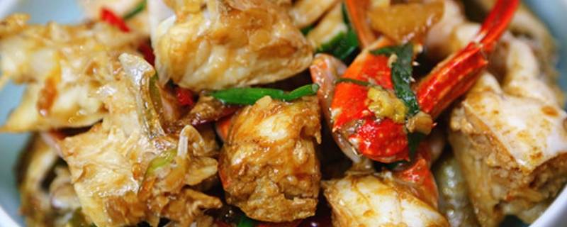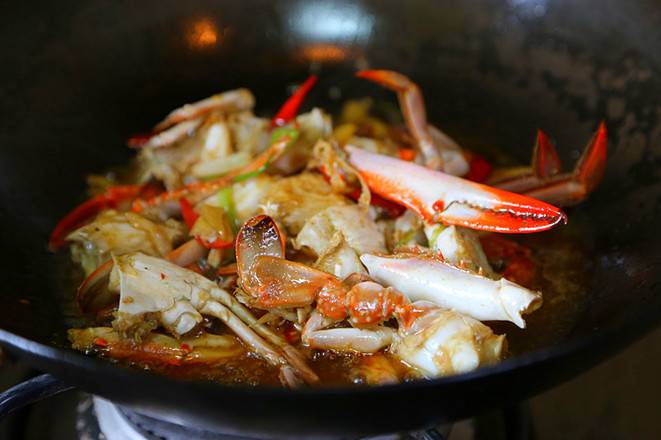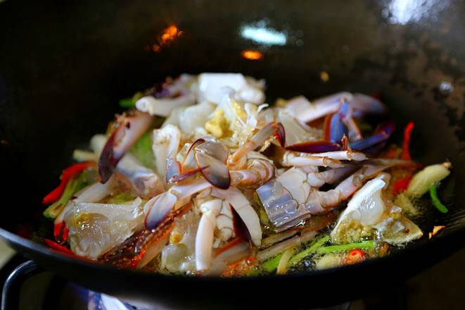 6、爆香以后放刚才切好的螃蟹块,转大火,开始爆炒。