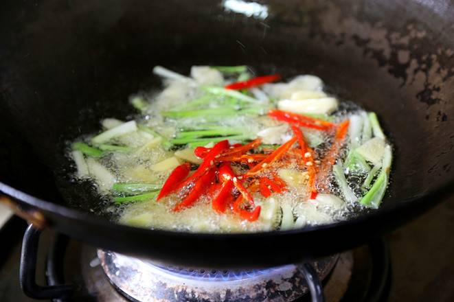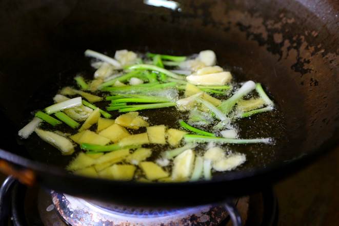 4、锅里上油,小火放大蒜生姜、韭黄,慢慢的炒香。