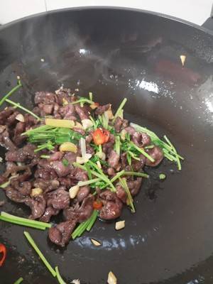 6、炒至断生加入香菜段。