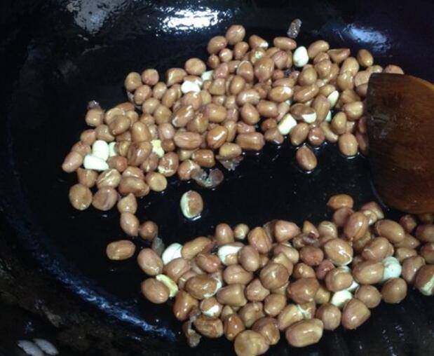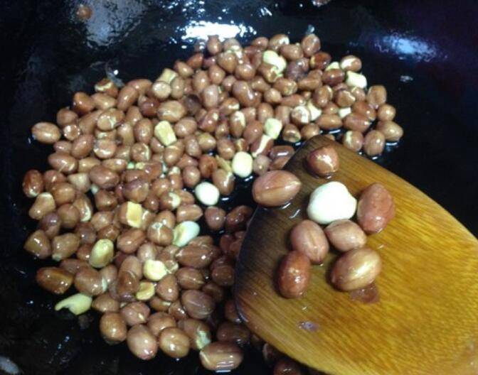 7.等这个花生颜色稍微有一点变得深了,就可以了关火了(颜色不要太深了,炒好的豆子会自热,如果炒的豆子颜色深了,最后的成品就会糊掉了)。