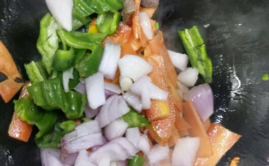 将所有原材料切好备用,将胡萝卜、洋葱和辣椒放入锅中翻炒。