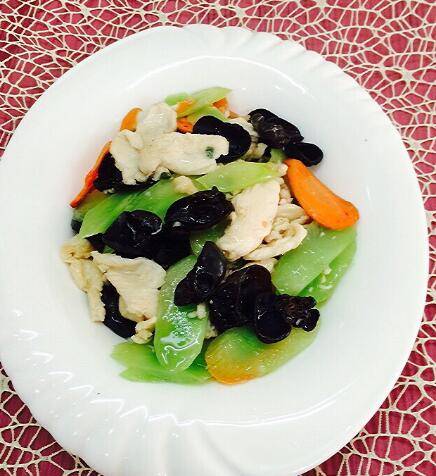 1、准备食材:鸡胸肉150g、莴笋半根、胡萝卜半根、泡发木耳一把、葱姜切末、蛋清1个、用于鸡肉上浆、淀粉少许、胡椒粉少许、盐、料酒、玉米油。