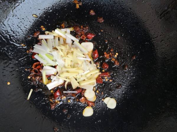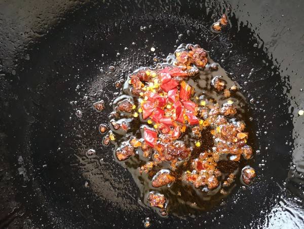 4、炒锅中加食用油,放入郫县豆瓣酱炒出红油。