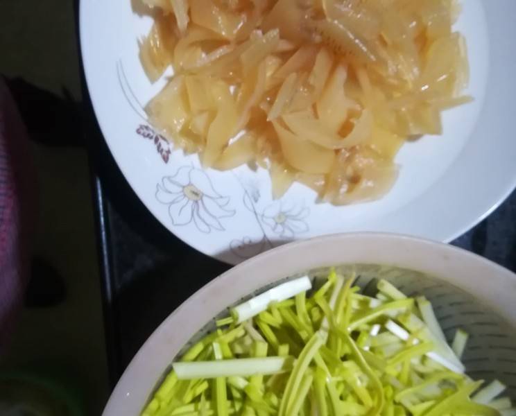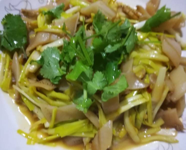 用料:海笋250克、蒜黄100克、盐适量、干辣椒适量、姜四五片、料酒两勺、胡椒粉适量、菜油三勺。