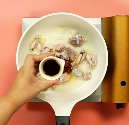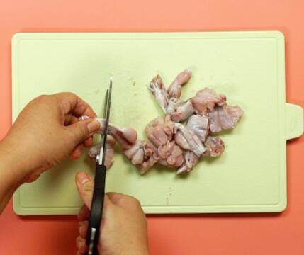 去皮牛蛙切块。