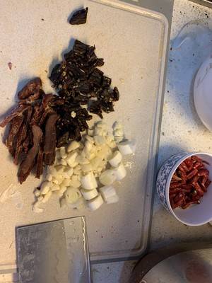 1、准备材料:牛肉干200克、干辣椒30个、蒜6瓣、葱一段、白糖30克。