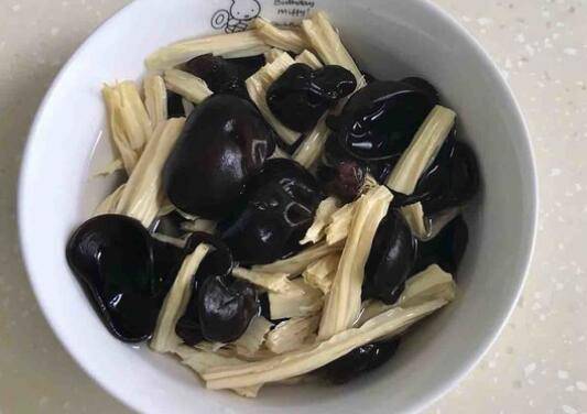 5、水烧开加点盐,然后将泡开的腐竹和木耳放入锅里煮开两分钟后捞出。