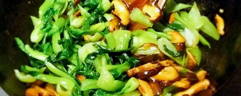 7、蘑菇断生,加入洗好的小油菜、葱丝翻炒。