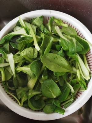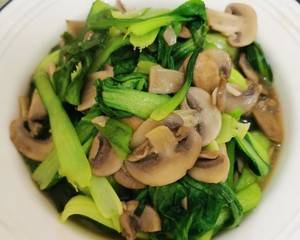 用料:小油菜2把、蘑菇100克、小葱2根、姜1片、青椒0.5个、蒜1瓣、盐适量、蚝油1勺、鸡精、味精、鸡汁1勺。
