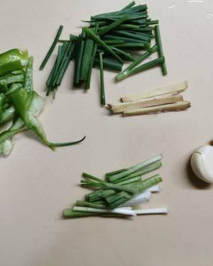 4、青椒、姜片切丝;小葱切断,分为葱白葱丝;蒜切碎;备用。