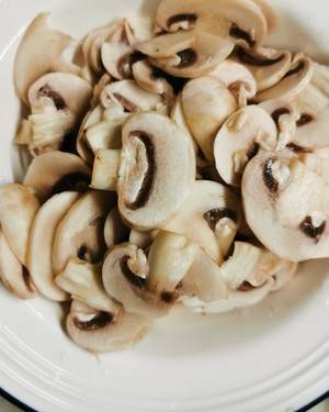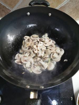 6、加入切好的蘑菇片,盖上锅盖闷煮。