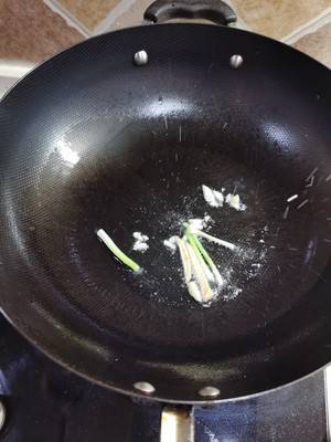 5、热锅冷油,油温八成热,加入葱白、姜丝、蒜末爆香。