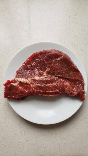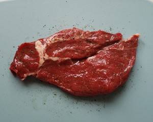 2、牛排均匀抹上盐、胡椒和橄榄油,放进盘子,盖上保鲜膜,腌制1个小时。