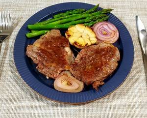牛排调料需要黑胡椒、盐、橄榄油、黄油、洋葱、大蒜、芦笋,牛排做法如下: