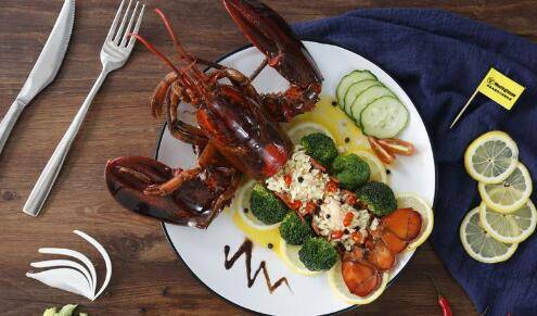 8、最后放上龙虾,在盘中摆上西兰花和切片的青柠,在食用前挤上少许的柠檬汁。
