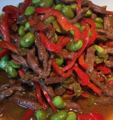 牛肉、毛豆、红辣椒、盐、糖、酱油、盐。