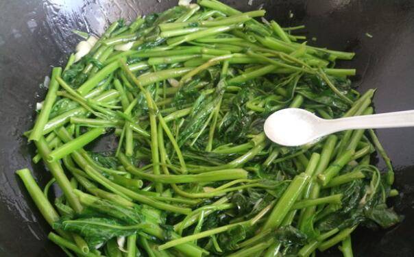 用料:空心菜300克、蒜瓣6个、油适量、盐3克、鸡精2克。
