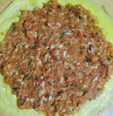 6、倒入肉馅铺平。