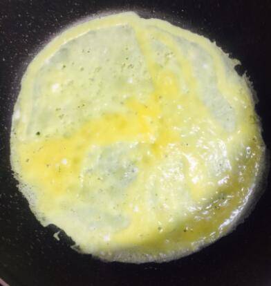 4、取平底不粘锅,倒入一勺蛋液。