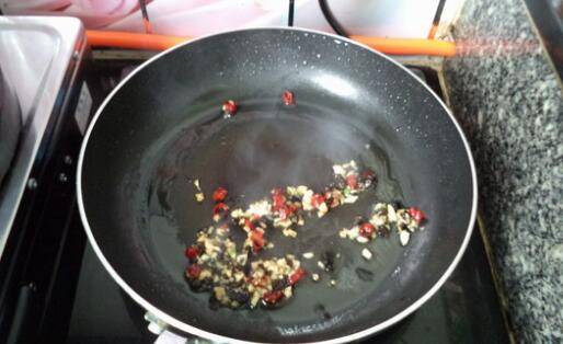 4、食用油5ml, 倒入蒜片,鱼干,翻炒均匀,生抽10克,鸡粉2克。