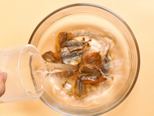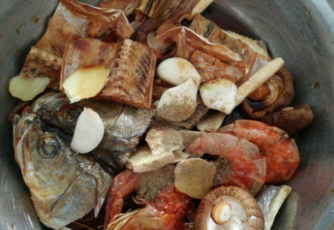2、将鲈鱼干用剪刀剪成小块;将海虾干、香菇干和鲈鱼干一起放入小盆中,然后放入适量生抽。