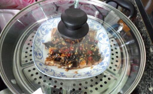 5、充分浸泡一段时间,让鱼干变软一点充分入味,然后将鱼干放入盘子中,汤汁倒掉,然后将盘子放入蒸锅中。