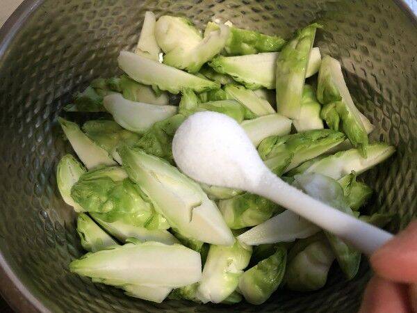 4、放入盆里加入适量盐腌制半天,上面最好压上重物。