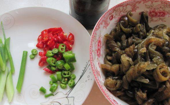 用料:海茸10克、盐3克、生抽1勺、小辣椒2个、鸡精2克、葱2克、姜2克、花生油。