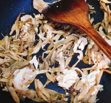 8.倒入黄花菜肉丝。翻炒均匀。下调味,糖1勺、生抽2勺、蚝油1勺、盐半茶匙。