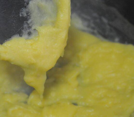 6.锅里倒入250克水,烧开后将玉米面糊倒入,左手倒,右手搅,用锅铲不停地搅,以防有疙瘩。