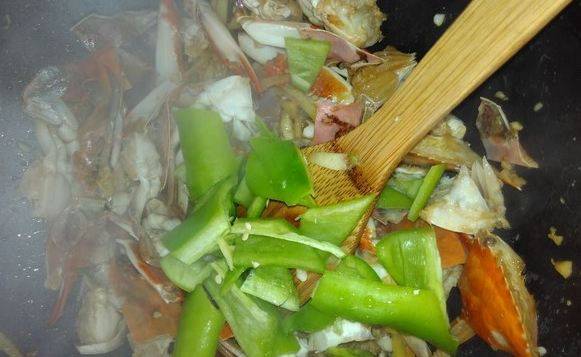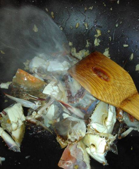 6、把螃蟹放下去炒制少会,倒适量料酒,生抽继续炒。