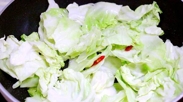 9、调入盐、白醋和少许白糖,翻炒至卷心菜断生即可。