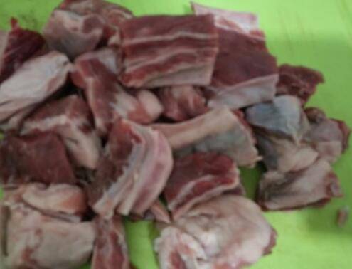 2、牛肋排解冻后用清水浸泡2小时左右,期间换一两次水,把牛肋排洗净后改刀切成小方块。