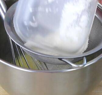 2、将做好的低筋面粉筛入盆中,玉米油加热到80度左右,倒入面粉盆里搅拌均匀。