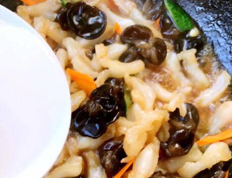 6、加香醋去腥,水淀粉勾芡翻炒即可。