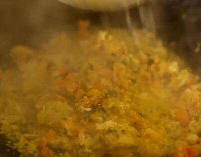 3、旺火热锅,锅中加少许色拉油、少许猪油,放入葱姜末煸香,倒入蟹粉翻炒。