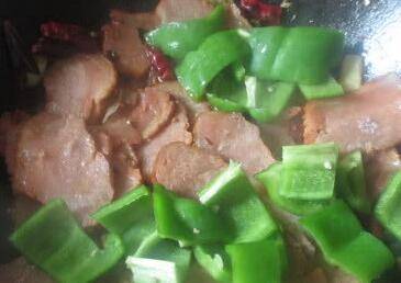4、放入鸭脯肉翻炒,放入青椒,大火翻炒5分钟。
