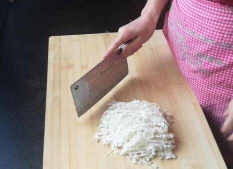 3、将豆腐切成0.5厘米的小块,泡软的粉条切成1厘米长的小段备用。