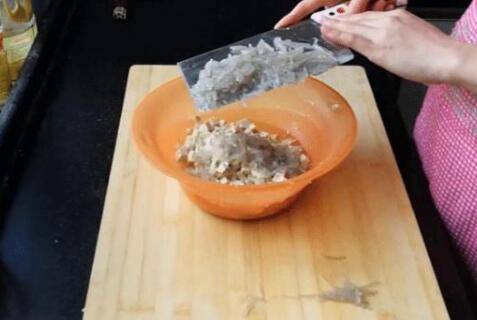 4、将剁好的白菜,豆腐丁,粉条加到一个盆内,加入姜末,葱末,香油,盐,猪油,生抽,十三香搅拌均匀。