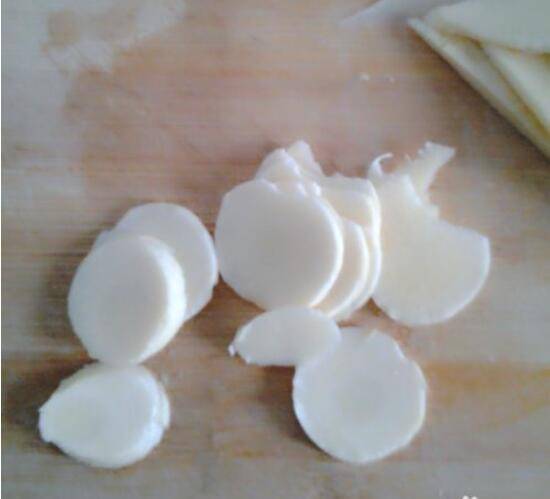 2、大一点的笋,一般是竖着从中间切一刀,然后再把一半的冬笋竖着切成薄片,一般切的厚度为2-3mm。