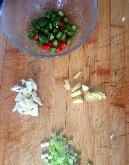 3、虾剪好后洗净,准备大蒜、生姜、辣椒。