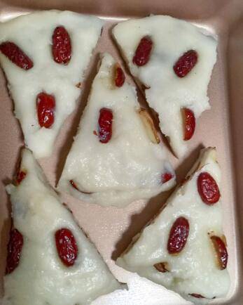 最佳答案用料:糯米面2500g、凉水适量、金丝枣。1、糯米面用凉水,逐步加水搅匀,使其没有干面即可。2、准备泡好的红枣备用。3、把锅篦铺上油纸。4、把糯米粉均匀铺一层,然后铺一层红枣。记得边上留空隙,比较好熟。5、上锅蒸,蒸40分钟左右。6、蒸好后,倒扣晾凉,切块即可。