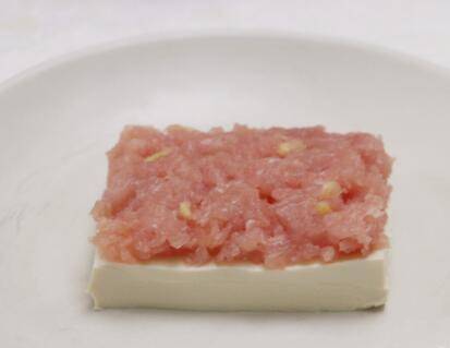 10、接着再放一片豆腐,铺上一层素馅。一层肉馅一层素馅直到最后一层。