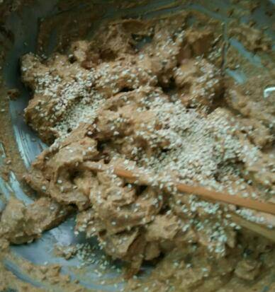 30分钟后加入适量地瓜粉,少许芝麻,继续搅拌均匀。