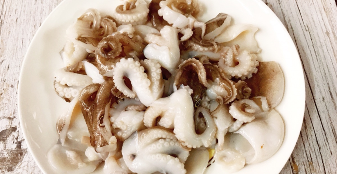 2、新鲜的八爪鱼沸水烫一下,备用。